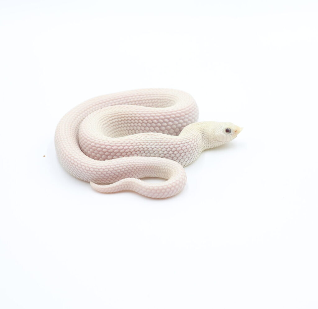 【潜性遺伝】全身が白くなるもののメラニン(黒色色素)は生成できるので目は黒色です。白変種とも呼ばれます。